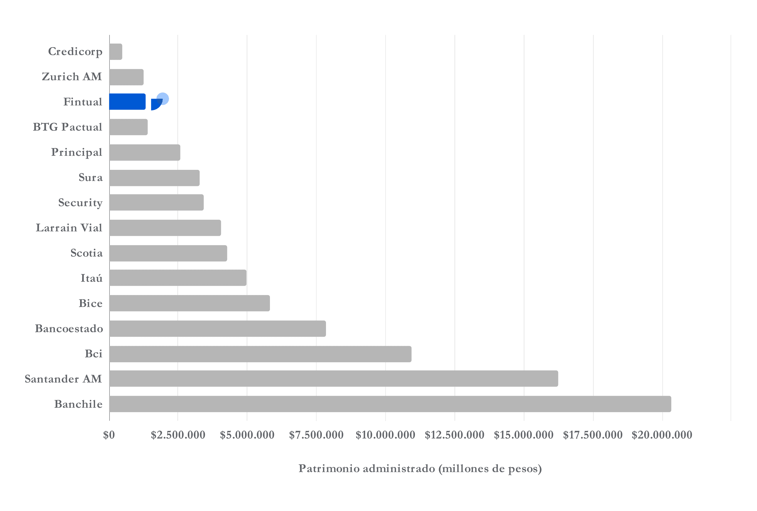 Patrimonio administrado en millones de pesos chilenos de las 15 mayores gestoras de fondos mutuos de Chile.